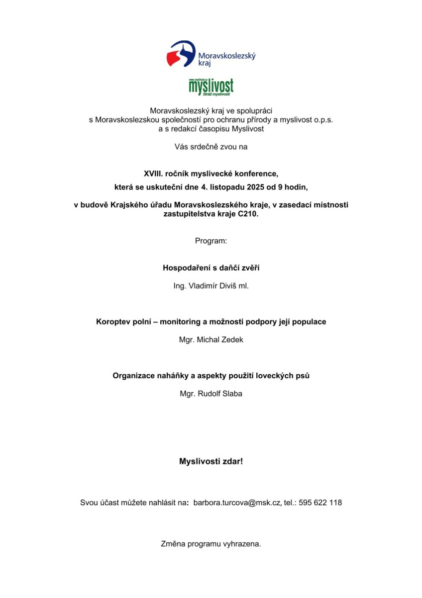 Kolegové z krajského úřadu srdečně zvou na již XVIII. ročník myslivecké konference, která se letos uskuteční dne 4.listopadu od 9 hodin v zasedací místnosti zastupitelstva v budově Krajského úřadu MSK.