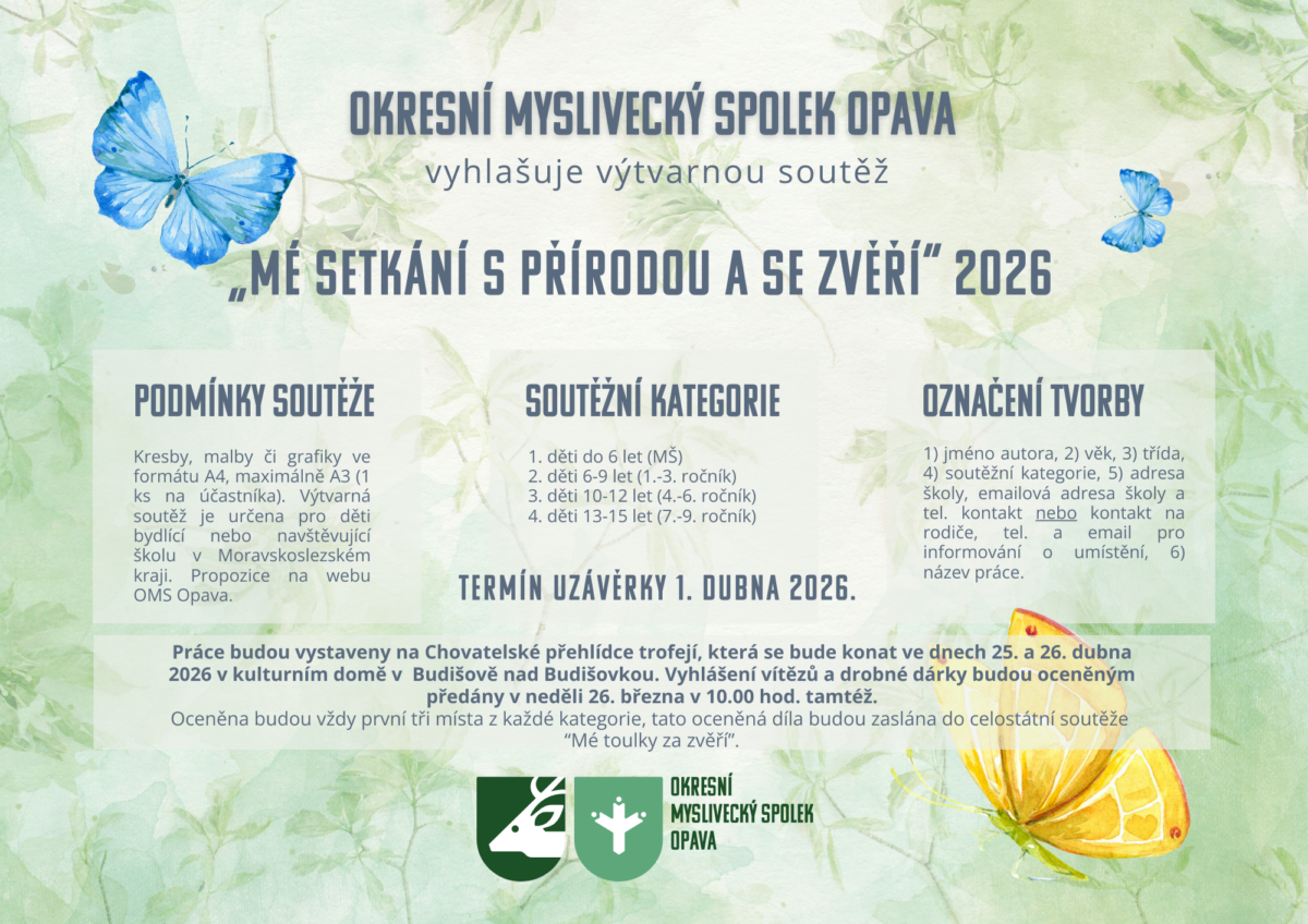 Kresby, malby či grafiky ve formátu A4, maximálně A3 (1 ks na účastníka) s motivy zvěře a přírody je nutno zaslat nebo předat do 1. dubna 2026 na adresu: OMS Opava, Slavkov 139, 747 57 Slavkov. Výtvarná soutěž je určena pro děti bydlící nebo navštěvující školu v Moravskoslezském kraji.